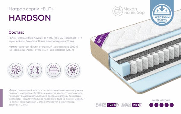 Матрас повышенной жесткости с блоком независимых пружин и плотного материала «Bicotton» в качестве твердого наполнителя, позволяет выдерживать большие весовые нагрузки без потери жесткости. Предпочтительное положение тела на данной модели – на спине. Также данный матрас отличается довольно значительной высотой – 24 см.