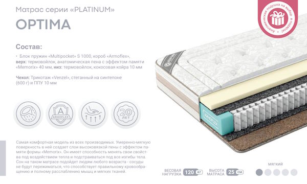 Самая комфортная модель из всех производимых. Умеренно-мягкую поверхность в ней создает слои высоковязкой пены с эффектом памяти формы «Memorix». Он имеет способность менять свои свойства под воздействием тепла и подстраиваться под все изгибы тела. Сон на таком матрасе подойдет людям любого возраста - сосуды не будут пережиматься, что способствует правильному кровообращению и полному расслаблению мышц и мягких тканей.